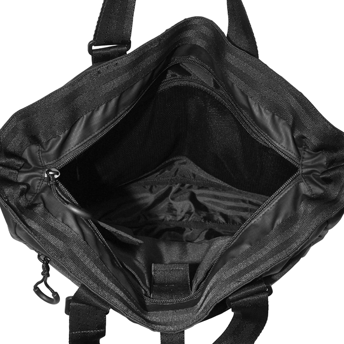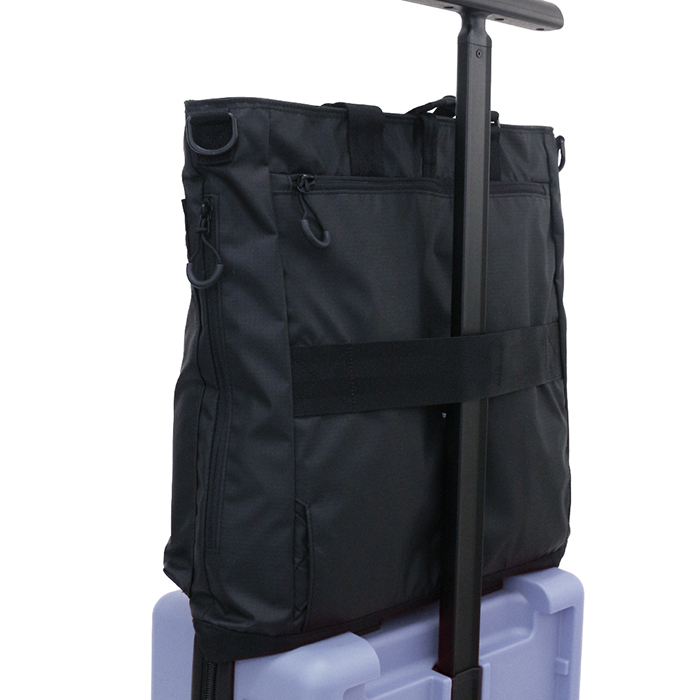 背面の収納式ショルダーパッドでリュックスタイルに、付属のショルダーベルトでショルダーバッグに、持ち手を調整すればトートバッグとしても使用可能。さらにキャリーケースにセットできるキャリーオン機能も搭載しています。